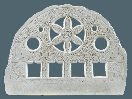 Λιθόγλυπτος ημικυκλικός φεγγίτης. Β΄ μισό του 18ου αι. Διαστάσεις: μήκ.: 81 εκ., ύψ.: 60 εκ., πάχ.: 3 εκ. ΒΧΜ 1475 - Curved stone skylight. Second half of the 18th c. Dimensions: l.: 81 cm., h.: 60 εκ., d.: 3 cm. ΒΧΜ 1475